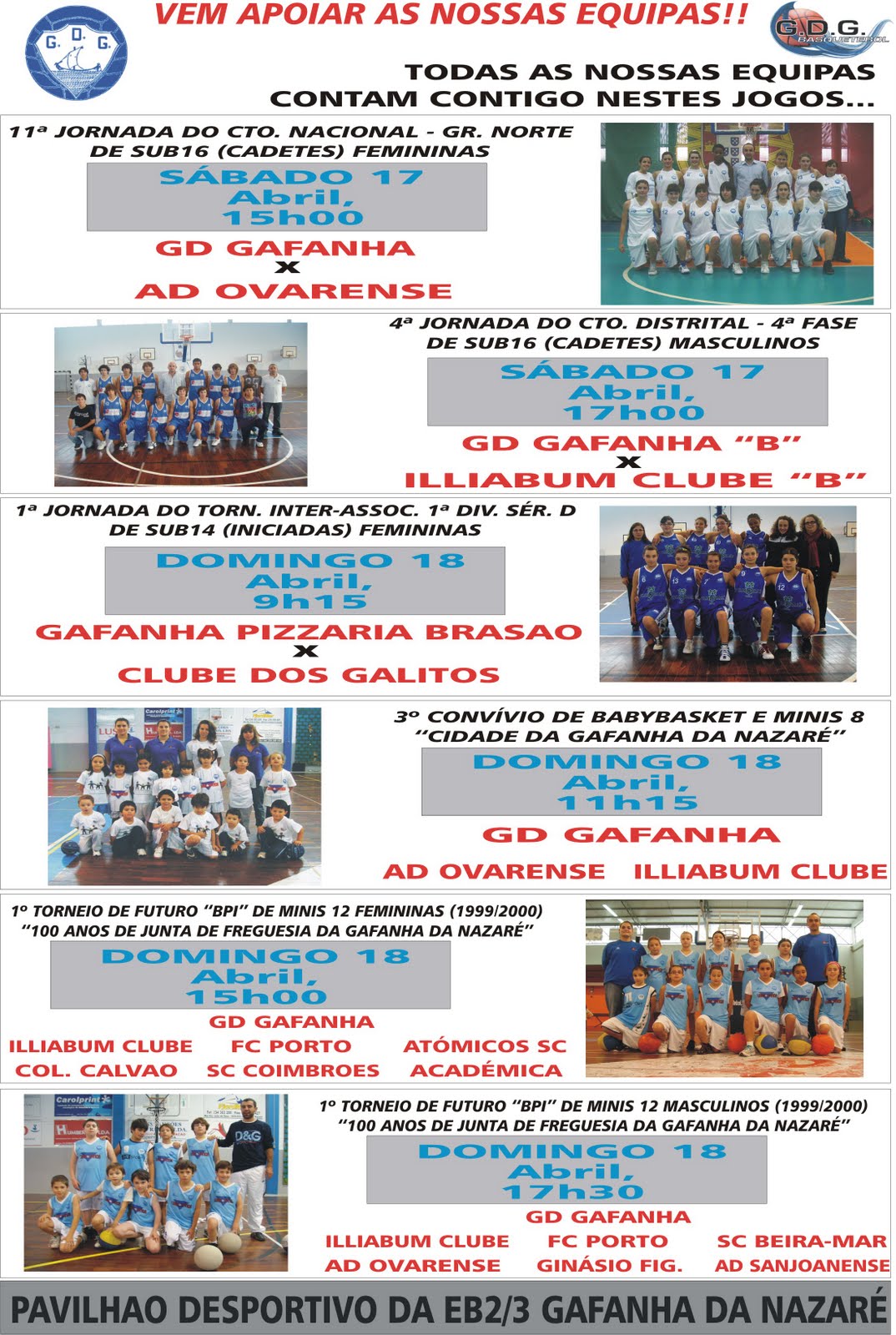 As atletas que representaram o GD Gafanha na 4ª Festa do Basquetebol Juvenil, realizada em Portimão de 7 a 11 de Abril de 2010, dignificaram o nosso clube com muito empenho e muita dedicação, que se transformou no título de Campeãs Nacionais para as 3 atletas que participaram na Selecção Distrital de Sub16 Femininas (Ana Graça'94, Joana Soeiro'95 e Andreia Branco'95) e num meritório 3º lugar para as 2 atletas que faziam parte da Selecção Distrital de Sub14 Femininas (Carolina Marques'96 e Inês Franco'96).