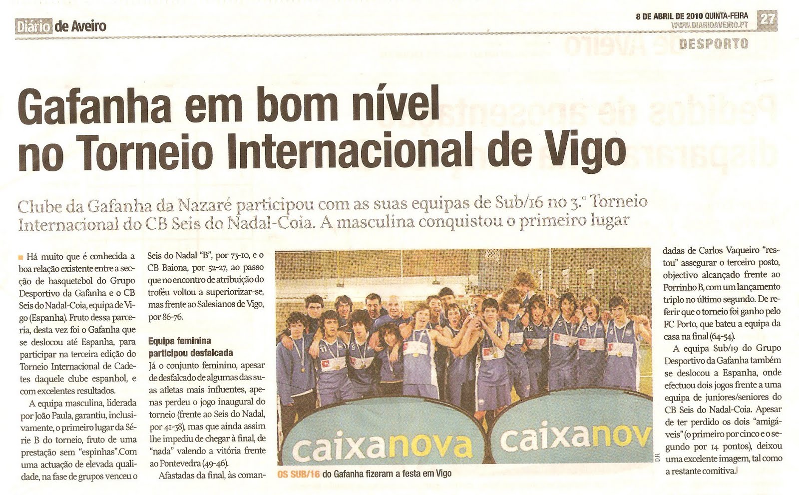 Com motivo da Comemoração da Elevação à Cidade da "Gafanha da Nazaré", o GDG Basquetebol organiza na manhã do Domingo dia 18 de Abril de 2010, apartir das 11h15, no Pavilhão Desportivo da Gafanha da Nazaré, o 3º Convívio de Babybasket e Minis 8 "Cidade da Gafanha da Nazaré", para crianças de 3, 4, 5 e 6 anos.