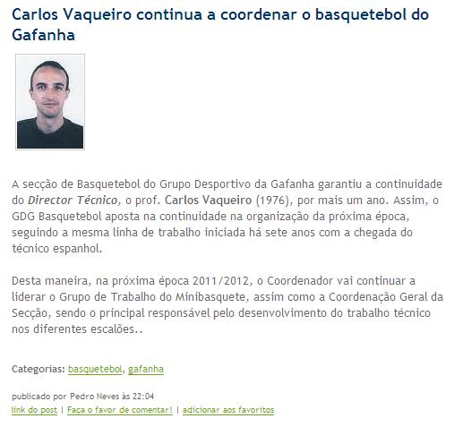 A Secção de Basquetebol do Grupo Desportivo da Gafanha garantiu a continuidade do Director Técnico, o prof. Carlos Vaqueiro (1976), por mais um ano. Assim, o GDG Basquetebol aposta na continuidade na organização da próxima época, seguindo a mesma linha de trabalho iniciada há sete anos com a chegada do técnico espanhol.
