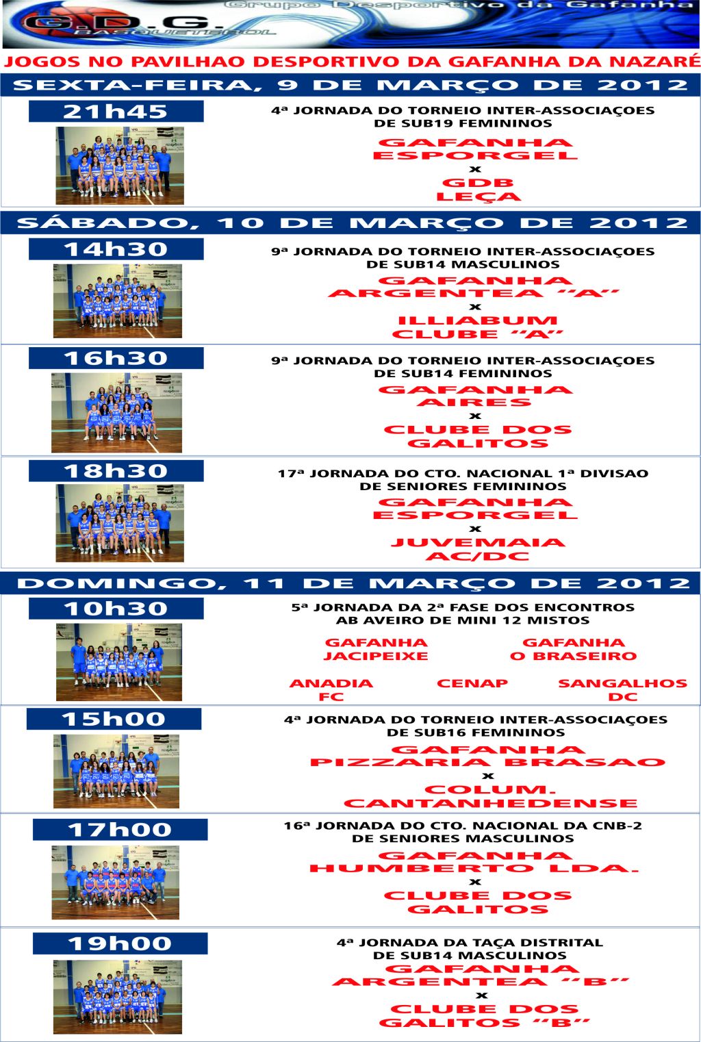 O Grupo Desportivo da Gafanha continua a apostar na promoção do Minibasquete como base para o nosso crescimento, sendo desta maneira que organizaremos neste Domingo, dia 11 de Março de 2012, a partir das 10h30, um novo Encontro de Minis 12 Mistos no Pavilhão Desportivo da Gafanha da Nazaré, com a participação das seguintes equipas: