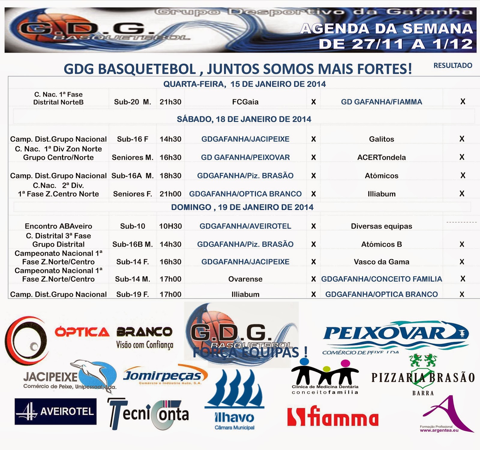 Resultados finais: GDGafanha 62 – AACCalvão 54; ADSanjoanense 54 – GDGafanha 49