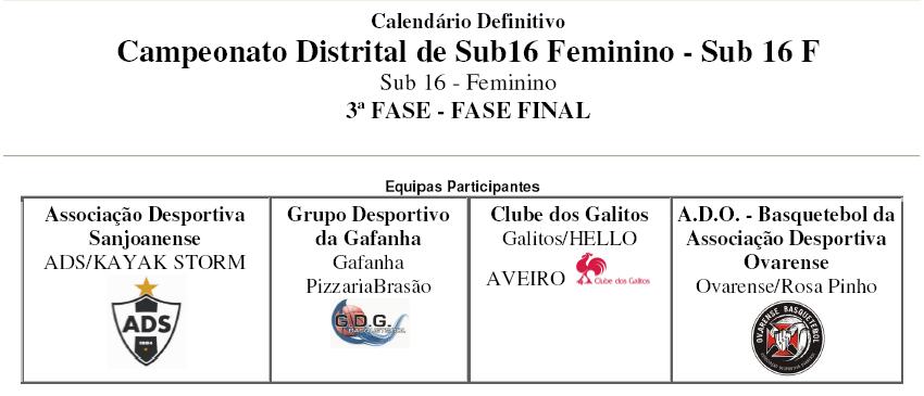 A nossa equipa GAFANHA PIZZARIA BRASÃO (Sub16 Femininos), marca presença novamente na Fase Final Distrital de Sub16 (é a actual vice-campeã), com uma tarefa muito difícil pela frente (contrariar o favoritismo da equipa da casa e ultrapassar outros adversários difíceis). Contudo, com o espirito combativo que nos caracteriza, confiamos em apresentármo-nos como adversário difícil para todas as equipas, tentando surpreender a algumas delas.